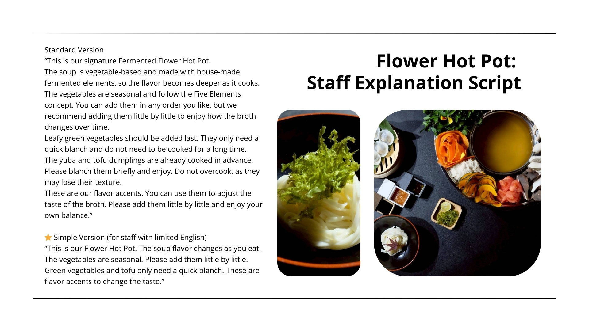 The outline covered why the ryokan decided to create a vegan menu, the key ingredients and distinctive style of the Fermented Flower Hotpot, detailed menu items with photos, and service scripts in both English and Japanese. For English, I also needed a simplified version that Japanese staff could comfortably use when speaking with guests.